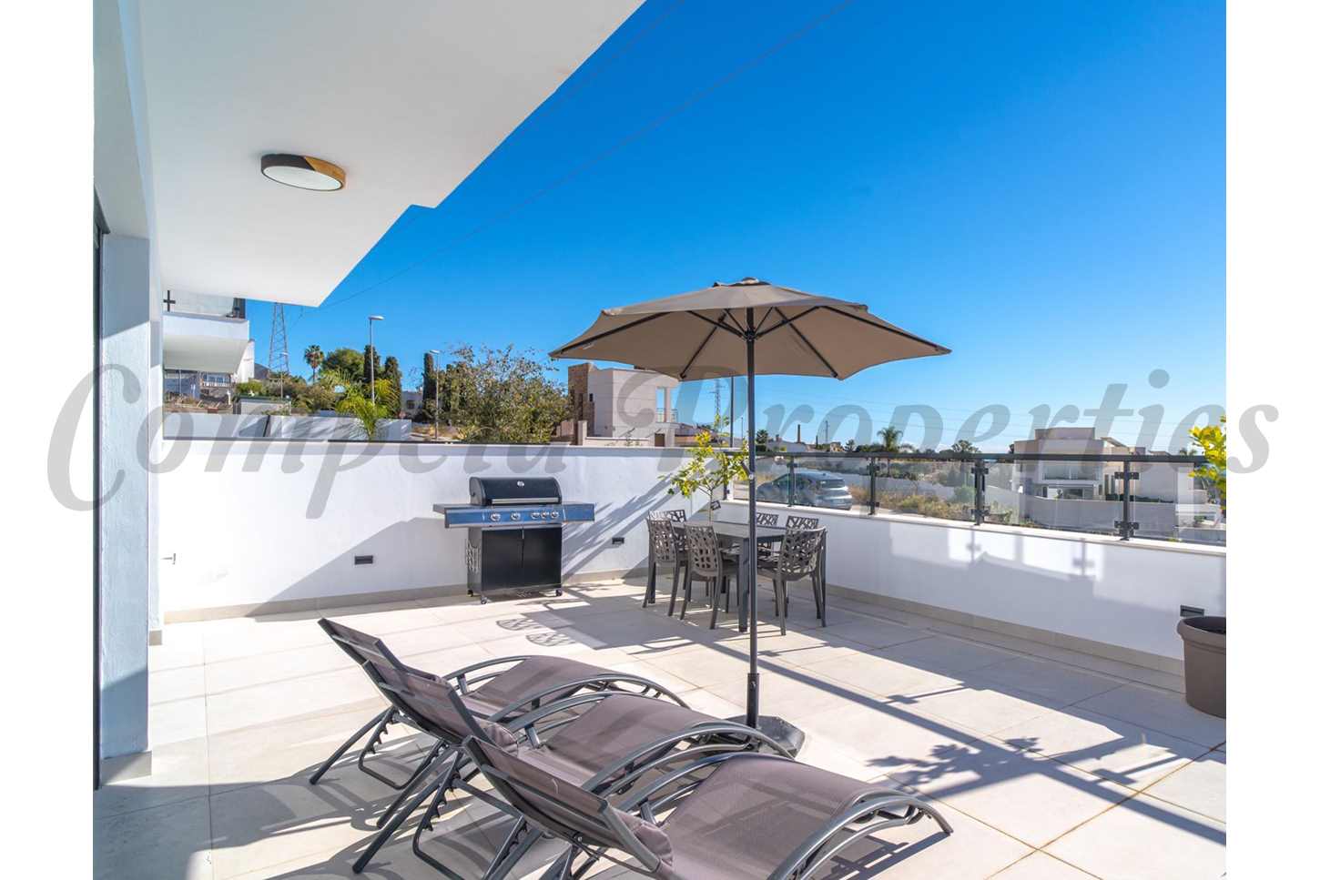Auf einer Fläche von fast 200 m² verteilt auf drei Ebenen bietet das Haus drei geräumige Schlafzimmer und drei stilvolle, moderne Badezimmer. Die Innenräume sind so gestaltet, dass sie das natürliche Licht optimal nutzen, und wirken hell, luftig und mühelos elegant, mit sorgfältig geplanten Räumen, die sowohl für ein komfortables Alltagsleben als auch für die Bewirtung von Gästen geeignet sind. Die Krönung des Anwesens ist eine beeindruckende Dachterrasse, ideal zum Sonnenbaden, für Drinks am Abend und um atemberaubende Sonnenuntergänge zu genießen.