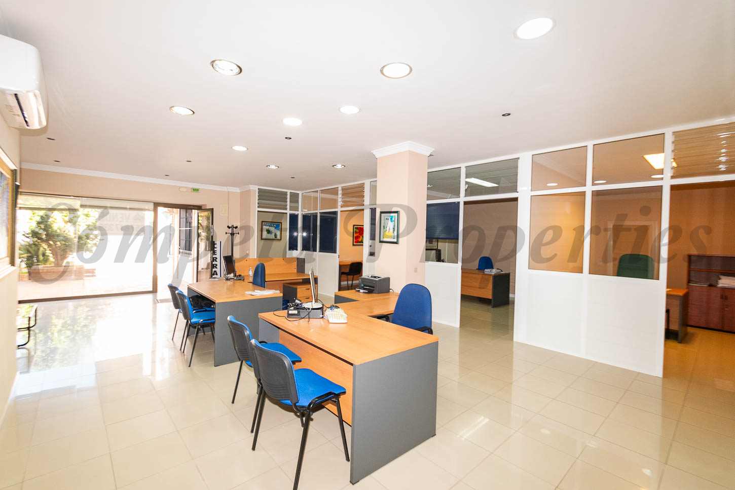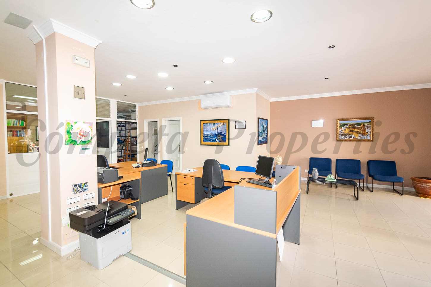 Su distribución es funcional y versátil, compuesta por seis despachos, dos salas de archivo, un aseo y un amplio recibidor de entrada, lo que permite adaptarlo a múltiples actividades profesionales, tales como oficinas, despachos profesionales, clínicas o centros de atención al público.