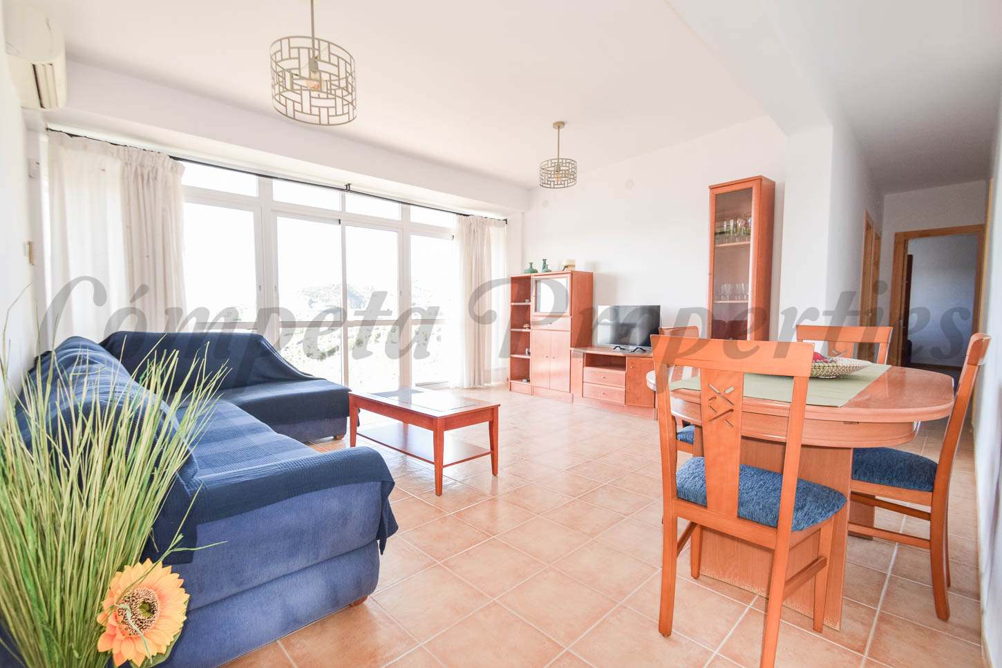 La propiedad se encuentra en una quinta planta de un edificio con ascensor y consta de una cocina completamente amueblada y equipada, un amplio y luminoso salón con zona de comedor y acceso a una terraza soleada durante todo el día y con vistas al mar. La propiedad tiene tres habitaciones y un completo cuarto de baño familiar con ducha.