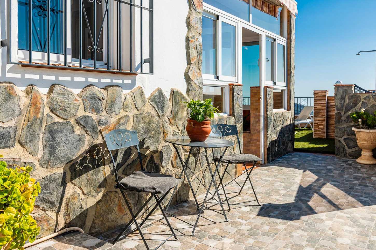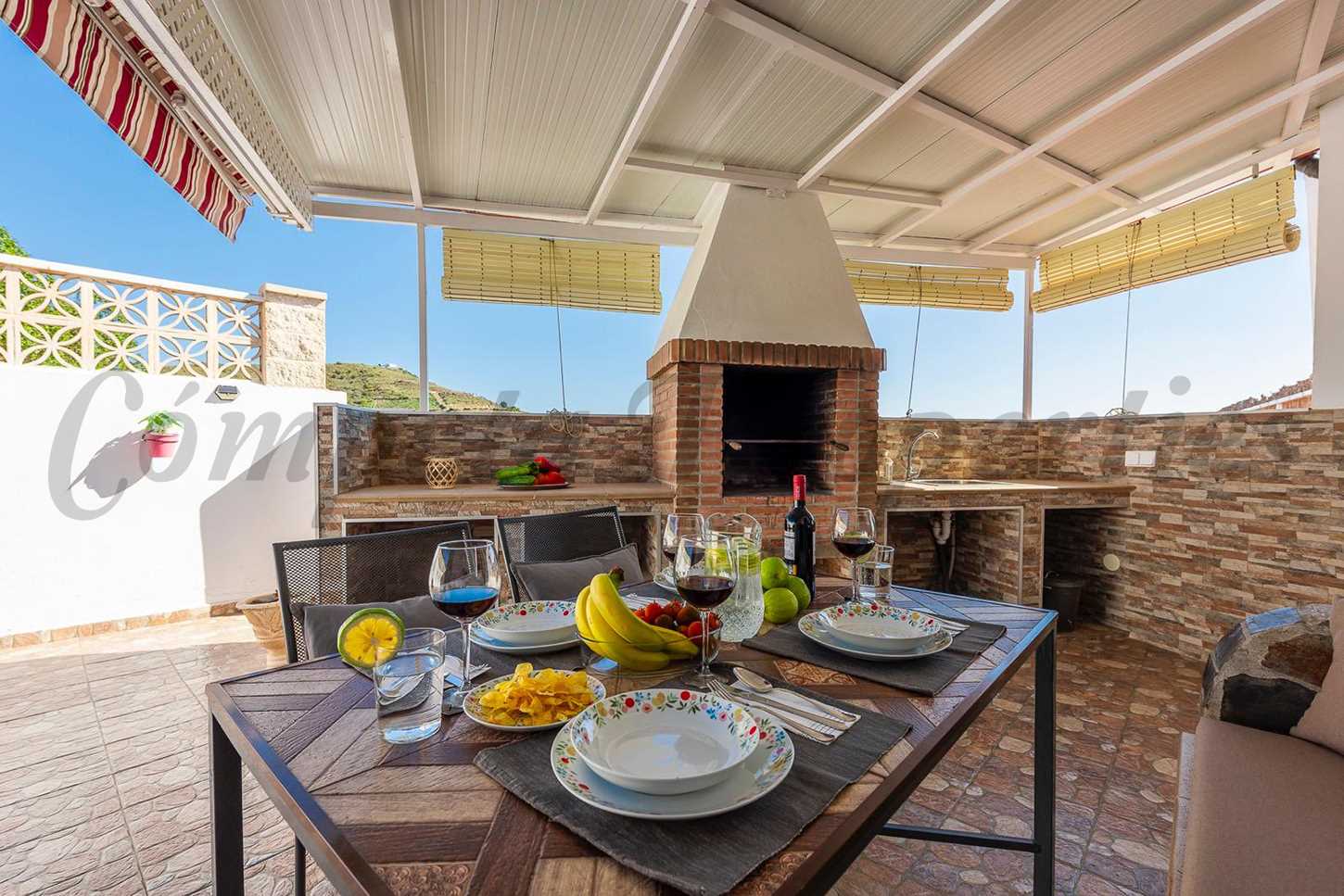 La villa tiene una terraza frontal cubierta y otra en el lateral donde está la barbacoa; un lugar perfecto para comer en la sombra ó relajarse. También hay mucho espacio para tomar el sol y una piscina de 5x3 metros para refrescarse. La zona de la piscina es 100% segura para los niños.