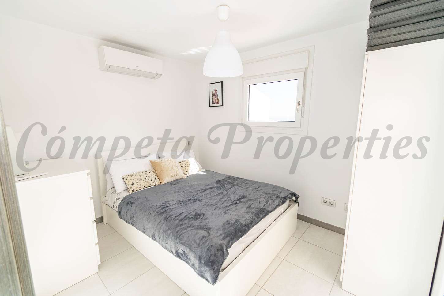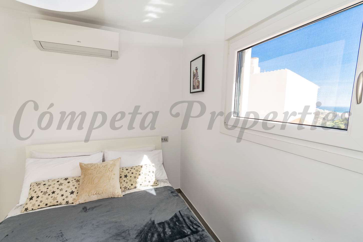 Al acceder a la vivienda encontramos un acogedor salón de buen tamaño equipado con aire acondicionado, junto a una cocina totalmente equipada con práctica barra americana. Desde aquí, unas escaleras conducen a la planta superior, donde se encuentra un cuarto de baño reformado con ducha y el dormitorio principal. Este luminoso dormitorio, también equipado con aire acondicionado, cuenta con un pequeño balcón y ofrece unas hermosas vistas al mar y al pueblo de Torrox, creando el lugar perfecto para despertarse cada mañana.