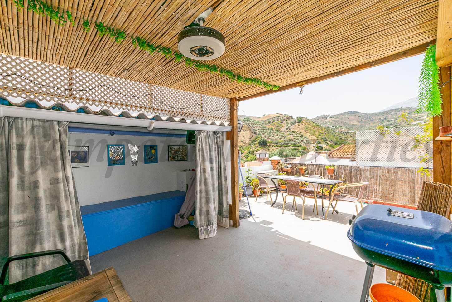 Från köket leder en liten trappa upp till takterrassen, med en stor pergola som erbjuder skugga för grillplatsen och där du kan koppla av och njuta av en lugn atmosfär med härlig utsikt över byn och landsbygden.